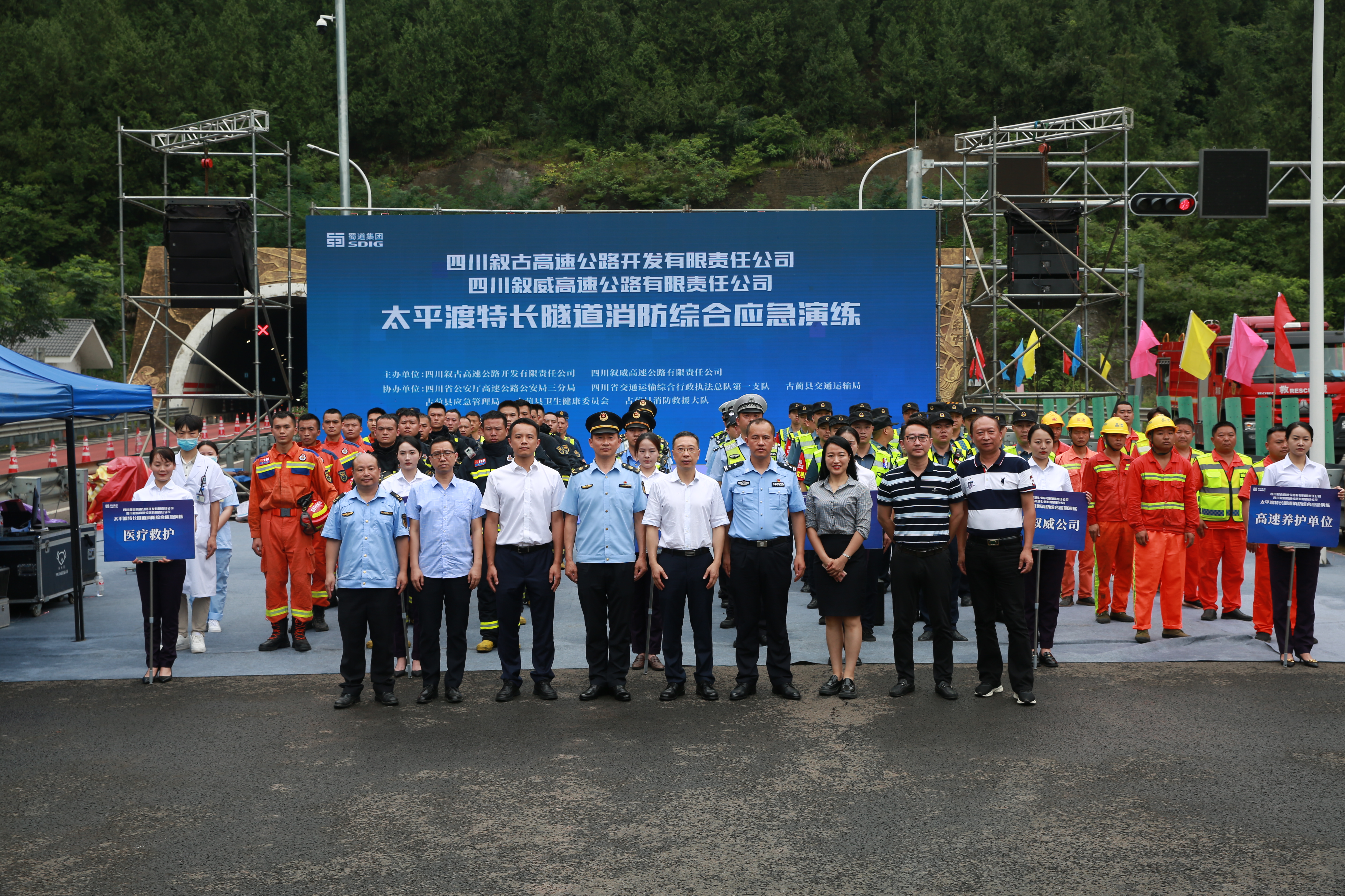6月29日,由敘古敘威公司主辦,四川省公安廳高速公路三分局、四川省交通運輸綜合行政執法總隊第一支隊、古藺縣應急管理局、古藺縣交通運輸局、古藺縣衛生健康委員會及古藺縣消防救援大隊協辦的S80古宜高速公路太平渡隧道消防綜合應急演練順利舉行。敘古敘威公司黨委書記、董事長、總經理劉小波出席活動并擔任演練總指揮。四川省交通運輸綜合行政執法總隊第一支隊副支隊長羅勇、四川省公安廳高速公路三分局案偵大隊大隊長鄭付彬出席觀摩現場并作指導。