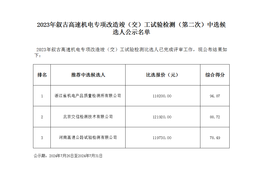 2023年敘古高速機電專項改造竣(交)工試驗檢測(第二次)中選候選人公示名單
