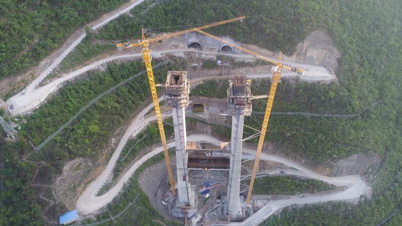 82年前,赤水之濱上演了一場“長征史上最光彩神奇的篇章”,82年后,一條承載著川黔兩地老區(qū)人民高速夢的神奇天路在此處正拔地而起。赤水河大橋主跨1200米,是世界上同類型橋梁中跨徑第二、主塔高度第二的峽谷鋼桁梁懸索大橋,該橋為325m+1200m+205m雙塔單跨吊鋼桁梁懸索橋,貴州岸錨碇為重力錨,四川岸錨碇為隧道錨。貴州岸引橋為2×30m+4×(4×40m)先簡支后結(jié)構(gòu)連續(xù)T梁,四川岸引橋為3×33m現(xiàn)澆預(yù)應(yīng)力混凝土箱梁。該橋梁樁基均采用人工成孔,主墩采用18根Ф3.5m大直徑樁基。該橋的主要工程特點為:大:大橋主跨1200米,是世界上同類型橋梁中跨徑第二、主塔高度第二的峽谷懸索大橋。難:一是超高索塔施工難(索塔最大高度243.5m);二是主梁吊裝難(采用1200m大跨徑的纜索吊裝工藝);三是地勢險要,施工運輸難。險:橋位地處50-75°近乎垂直的陡坡上,施工十分驚險。